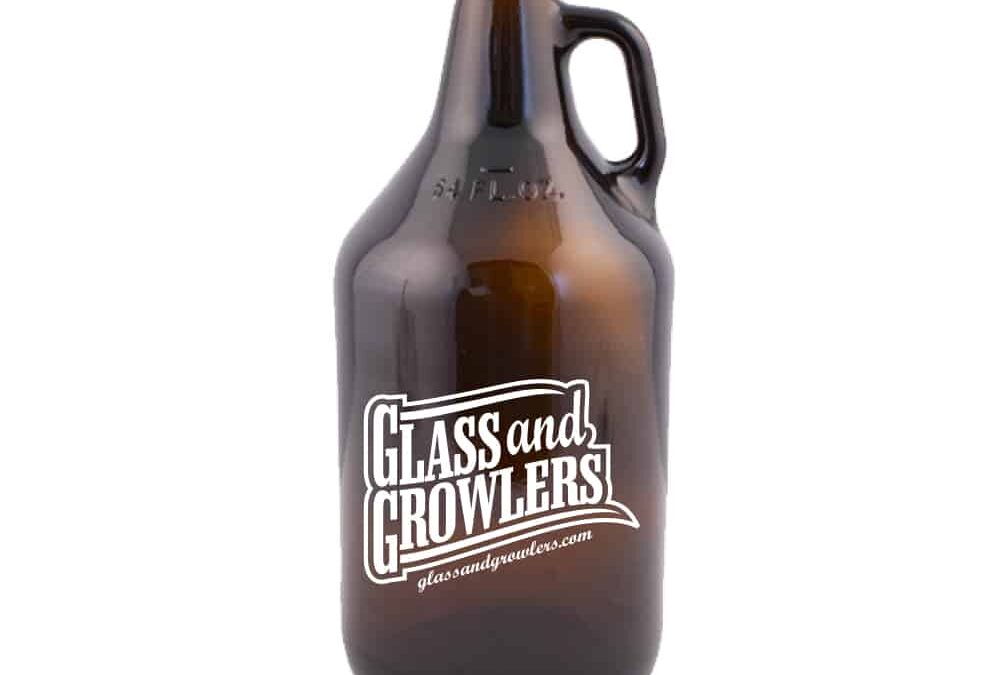 The image showcases a 64 Oz amber growler with a handle, a robust glass container ideal for storing and transporting craft beer in bulk. The amber tint protects the beer from light degradation, while the handle enhances portability for brewery customers and bar patrons. Offered by Glass and Growlers, this growler supports custom printing for brewery logos or branding, with a sturdy design suited for wholesale buyers and beer enthusiasts. The background may feature a brewery or bar setting, emphasizing its practical use.